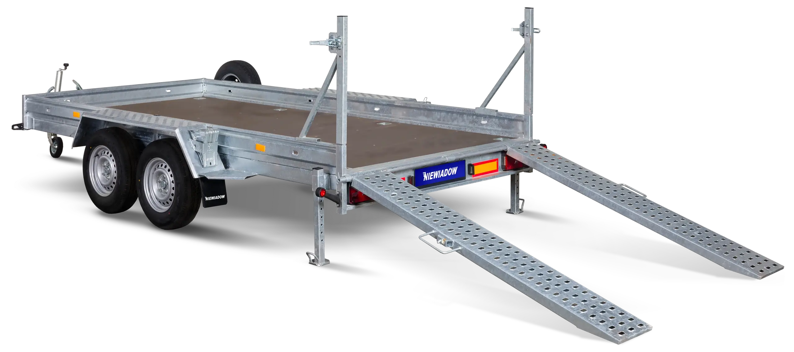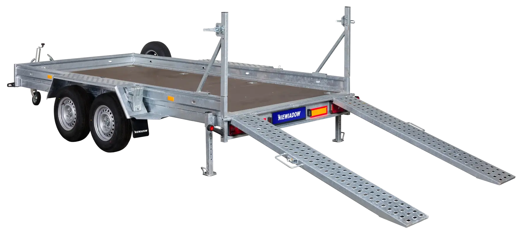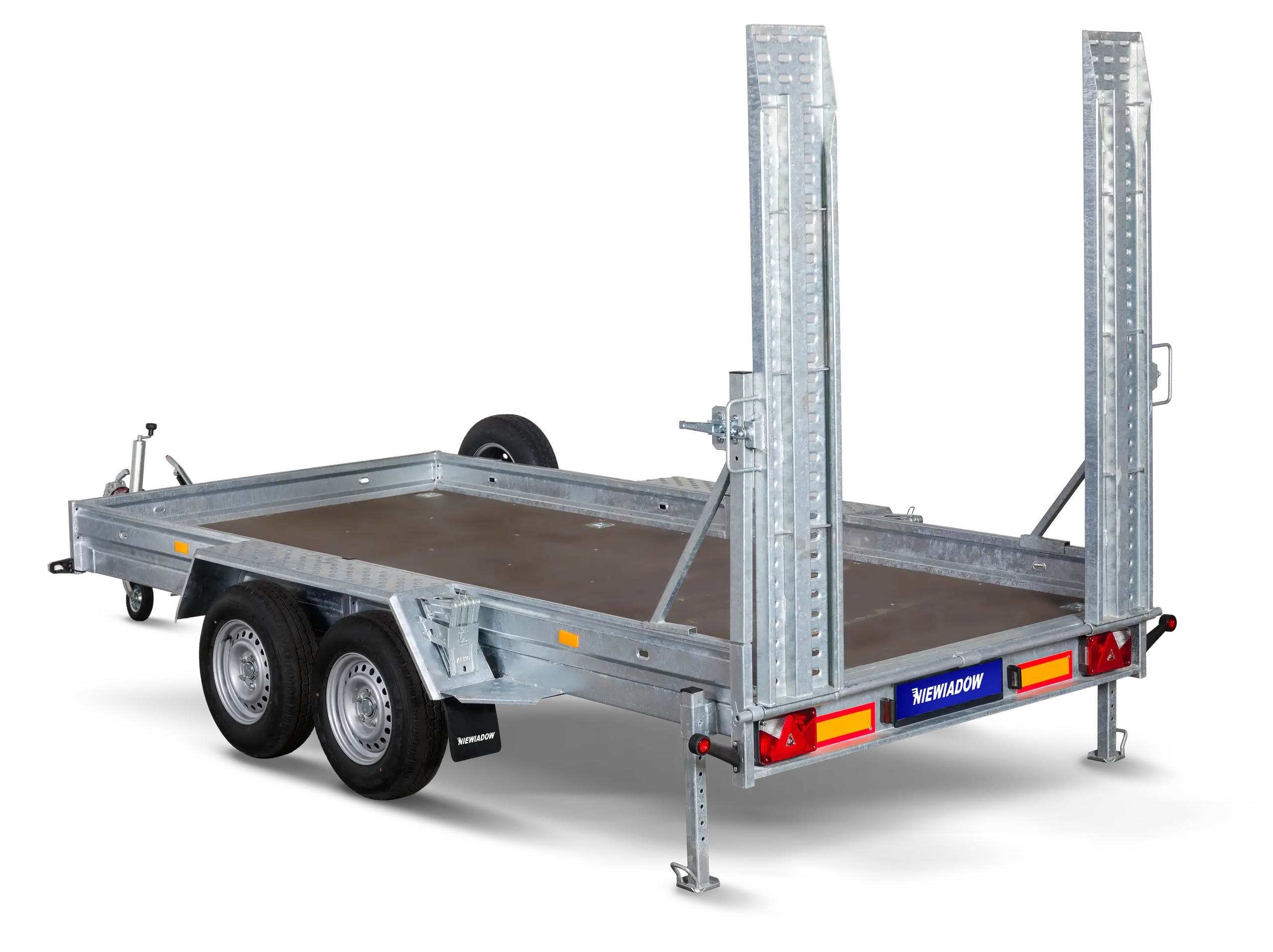 Staðalbúnaður: 8 sterkir handföng á gólfi tryggja örugga festingu búnaðar. Ferkantaðir stuðningar tryggja stöðugleika eftirvagnsins við lestun, affermingu og bílastæði. 2 metra stálrampar auðvelda að komast inn og út úr pallinum með vélum. Varadekk alltaf við höndina ef bilun á sér stað. Niewiadów byggingarvélarvagnar sameina endingu, virkni og öryggi. Þeir eru frábær kostur fyrir byggingarfyrirtæki, búnaðarleigufyrirtæki og alla sem þurfa áreiðanlegan eftirvagn fyrir flutning véla.